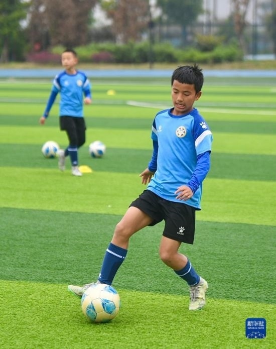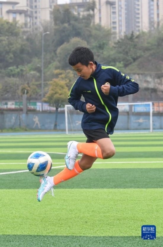 在瀘州天立春雨學(xué)校足球場,來自涼山彝族自治州的楊坤在進(jìn)行訓(xùn)練(3月28日攝)。