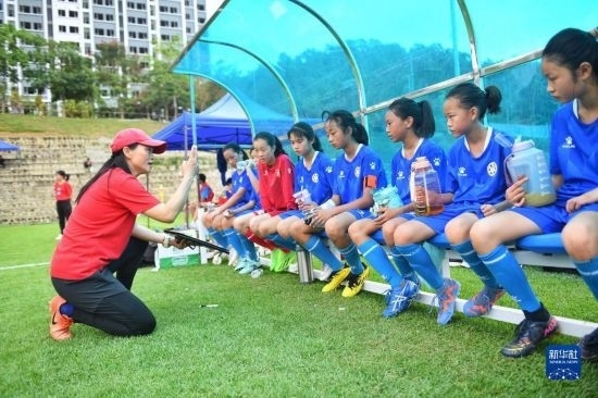 在海南瓊中縣舉辦的中國足協(xié)女足青訓(xùn)中心“希望杯”U12組比賽的空閑時段,四川隊主教練陳華(中)為隊員進(jìn)行戰(zhàn)術(shù)指導(dǎo)(4月9日攝)。