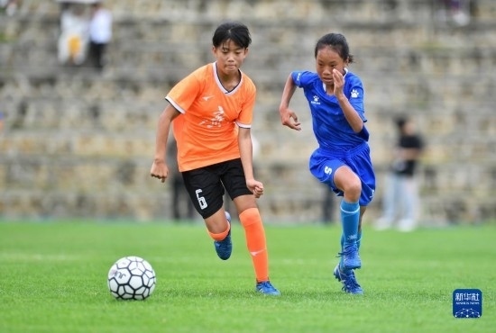 在海南瓊中縣舉辦的中國足協(xié)女足青訓(xùn)中心“希望杯”U12組四川隊對陣廣東隊的比賽中,來自涼山彝族自治州的四川隊球員舍布么扯鳩莫發(fā)邊線球(4月10日攝)。