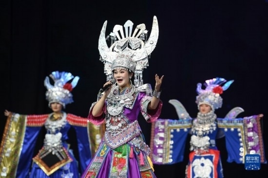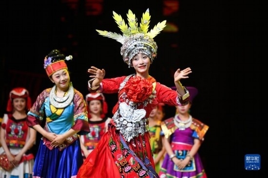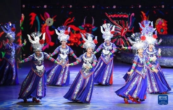 6月5日,演員在貴陽大劇院的《多彩貴州風(fēng)》演出中表演節(jié)目《金繡銀飾》。