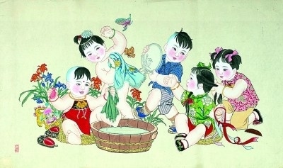將秦瓊、尉遲恭的門神形象立于展廳中一扇大門的兩側(cè),頓時營造出威嚴的氛圍。參展的年畫多刻印精細,描繪精致,題材分為驅(qū)邪納福、戲曲傳說、世俗生活和新年畫等。天津楊柳青年畫既有名家錢慧安、高桐軒舊版新印的名作,亦有青年畫家創(chuàng)作的新題材,如那啟明表現(xiàn)豐收題材的《金粟碧波》,邵文錦贊頌解放婦女、促進生產(chǎn)的《山鵲別處啼》,張鸞基于傳統(tǒng)年畫《五子奪蓮》創(chuàng)作的愛國衛(wèi)生題材年畫《五子愛清潔》等。濰坊楊家埠以“舊瓶裝新酒”創(chuàng)作新年畫,如《農(nóng)忙托兒所》上題有“爹媽安心去生產(chǎn),加緊建設(shè)新中國”。