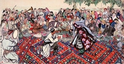 繞過紅色展墻,黃胄于1962年創(chuàng)作的《豐樂圖》赫然在目,拉開了展覽第一篇章的序幕。花團(tuán)錦簇的地毯上擺滿瓜果,人們圍坐在一起載歌載舞,歡慶豐收。畫面中的眾多人物雖姿態(tài)各異,但都喜笑顏開,感染著觀者。作品描繪出熱烈的慶祝場(chǎng)面,富有濃郁的地域特色,是新疆各族人民團(tuán)結(jié)和睦、意氣風(fēng)發(fā)的生動(dòng)寫照。