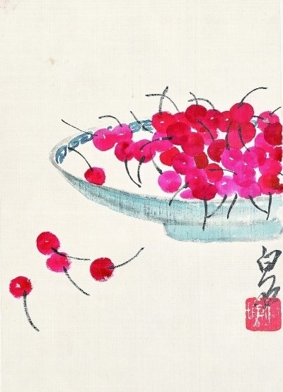 展柜中,不大的冊(cè)頁引得眾人圍觀。顆顆櫻桃被齊白石描繪得鮮嫩欲滴,它們擠在一個(gè)素樸的青花瓷盤中,還有幾顆散落在外,尤其鮮亮奪目。《盤中櫻桃》是齊白石《聚珍十開冊(cè)》中的一幅,作于20世紀(jì)30年代。在這套冊(cè)頁中,無論是荷花游魚、麥穗螞蚱還是汀渚魚鷹,都在齊白石筆下顯得格外逼真?zhèn)魃瘛?/p>