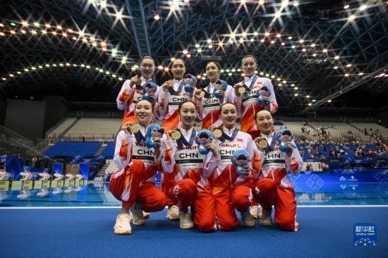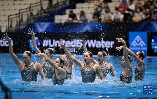 7月21日,中國隊在比賽中。當日,在日本福岡舉行2023年世界游泳錦標賽花樣游泳集體自由自選決賽中,中國隊以329.1687分的成績獲得冠軍。新華社記者 夏一方 攝