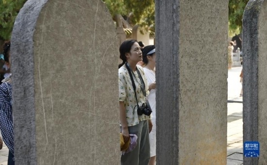 8月7日,游人在嵩陽書院內(nèi)參觀“大唐嵩陽觀紀圣德感應(yīng)之頌碑”。