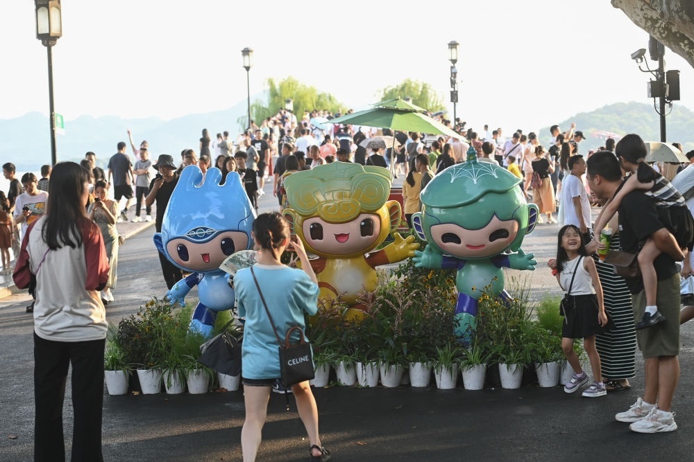 游客在位于杭州西湖景區(qū)的斷橋邊與杭州亞運會吉祥物合影(2023年8月21日攝)。新華社記者 黃宗治 攝