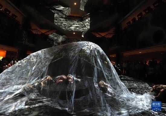 當(dāng)日,上海博物館攜手杭州良渚遺址管理區(qū)管理委員會推出“研色·良渚之夜”沉浸式綜合藝術(shù)秀演出。作為“何以中國”系列大展的第二展“實(shí)證中國:崧澤·良渚文明考古特展”的活動之一,“研色·良渚之夜”采用現(xiàn)代舞、服裝秀、音樂秀和數(shù)字投影燈光秀等多種舞臺藝術(shù)形式,結(jié)合良渚核心色彩和文化元素,讓觀眾沉浸式體驗(yàn)良渚穿越五千年的美學(xué)文化。新華社記者 任瓏 攝