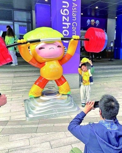 10月5日,亞運(yùn)會舉重場館外,觀眾爭相與吉祥物合影,一位小朋友特意擺出與吉祥物“琮琮”一樣的舉重姿勢合影留念。本報記者 楊震攝/光明圖片