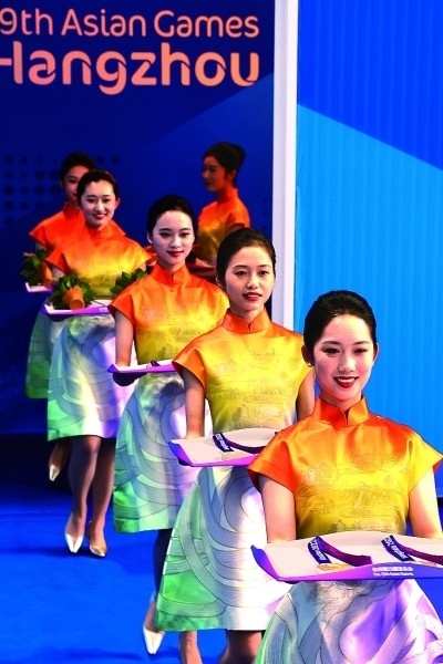 9月30日,亞運(yùn)會跳水項目頒獎儀式上,禮儀人員手托裝有獎牌的托盤,面帶笑容走向頒獎臺。本報記者 楊震攝/光明圖片
