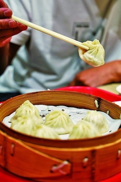 一名游客在吃杭州小籠包。本報記者 陳茵攝/光明圖片