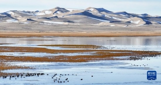 10月18日,在阿爾金山國家級自然保護(hù)區(qū),針尾鴨等水鳥在依協(xié)克帕提湖棲息(無人機(jī)照片)。