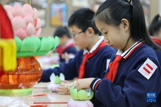11月22日,河北省霸州市勝芳鎮(zhèn)紅光小學的學生在學習制作勝芳花燈。