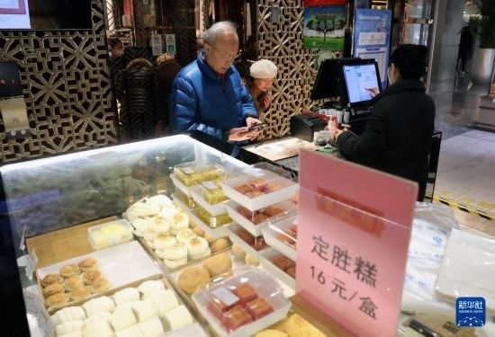 1月9日,在黃河路上的老字號點心店杏花樓,市民在選購劇中的同款點心定勝糕。新華社記者 劉穎 攝