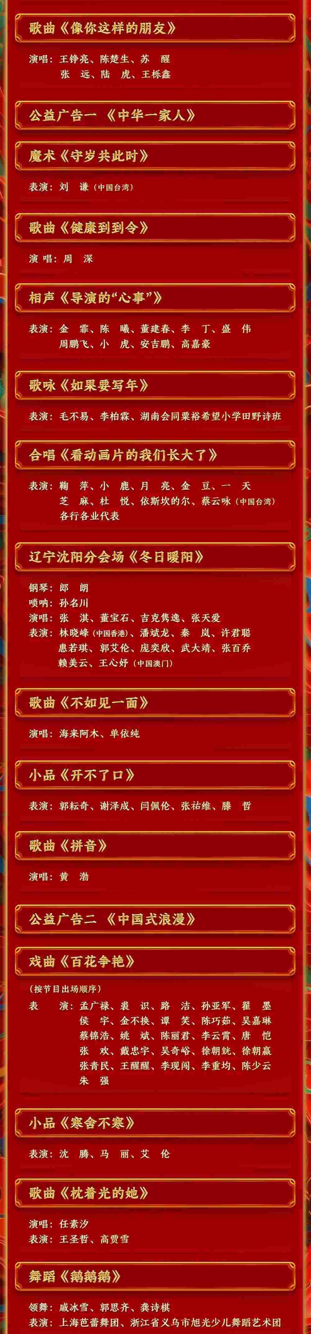 整臺晚會堅持“歡樂吉祥、喜氣洋洋”的總目標(biāo),涵蓋歌曲、舞蹈、相聲、小品、戲曲、武術(shù)、魔術(shù)、雜技、音樂劇、微電影等各類型節(jié)目,為全球華人奉上一道平實、喜慶、優(yōu)美的“文化大餐”。