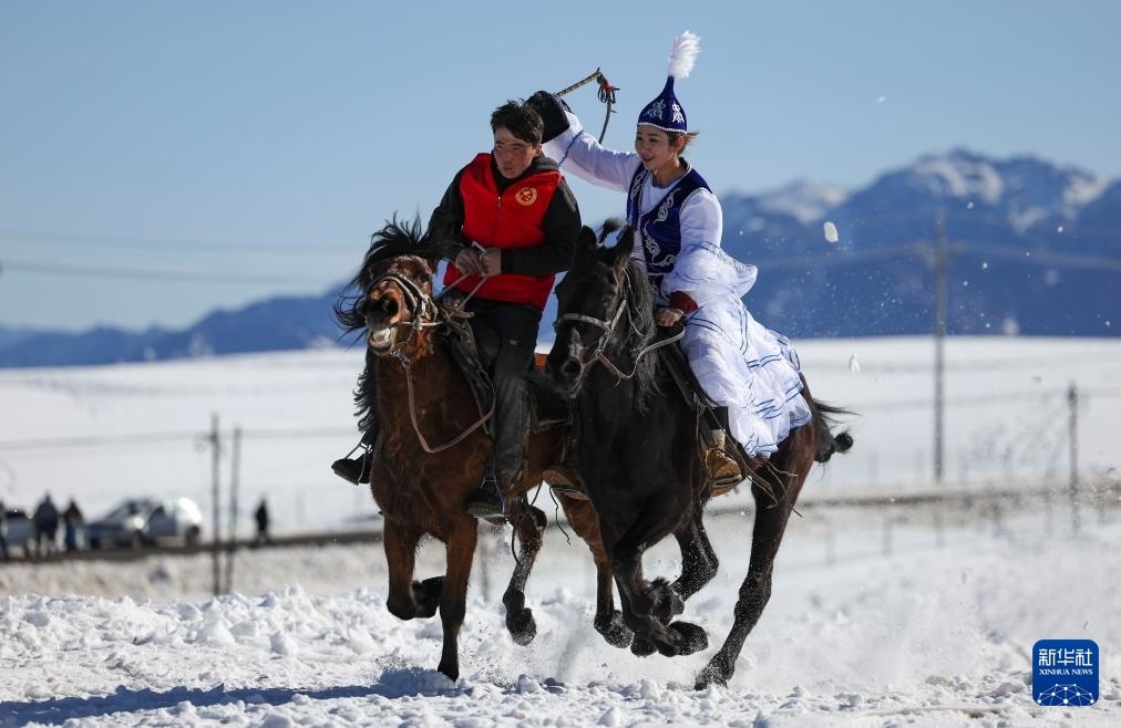 農歷大年初二,新疆烏魯木齊縣“春節(jié)八天樂”系列活動——傳統(tǒng)體育民俗鬧新春在甘溝鄉(xiāng)進行。村民們在冰雪覆蓋的烏拉斯臺草原上進行雪地賽馬、“姑娘追”、馬上拾銀、叼羊等比賽,歡度新春。