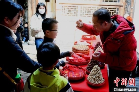 福建民俗博物館內喜籮攤位前吸引孩子觀看,感受傳統(tǒng)年味。 中新網記者劉可耕攝