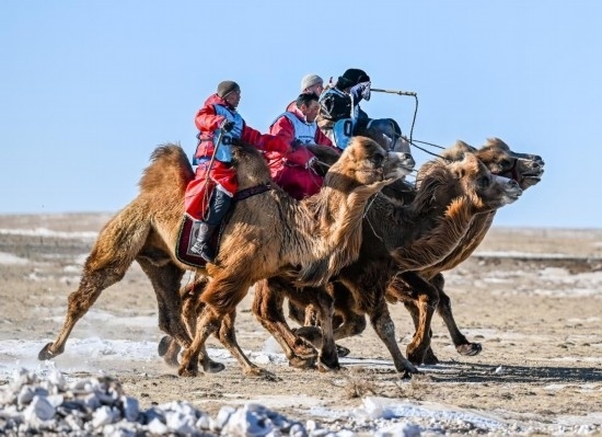 茫茫草原能賽馬,茫茫沙漠就能賽駱駝。2023年底在阿拉善右旗舉行的阿拉善萬峰駝那達慕大會上,設(shè)置了駱駝短距離速度賽、長距離耐力賽、接力賽等,還有駝球表演賽。按照當(dāng)?shù)啬撩竦恼f法,賽駱駝就得在冬天,因為冬天的駱駝最漂亮。