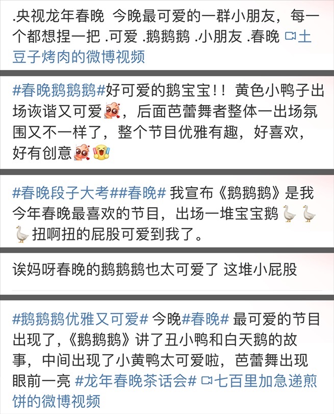 當(dāng)你提“鵝鵝鵝”,自然要期待“曲項向天歌”。駱賓王、唐詩宋詞、中華文化....看到節(jié)目單上的題目《鵝鵝鵝》,大概很多觀眾都以為是要詠詩。當(dāng)大幕開啟,柴可夫斯基的《天鵝湖》奏起,氣氛瞬間變得端莊典雅了,可接下來出場的是一群圓滾滾、扭著屁股的小小鵝,這波反差萌,讓網(wǎng)友直呼“創(chuàng)意絕了”。