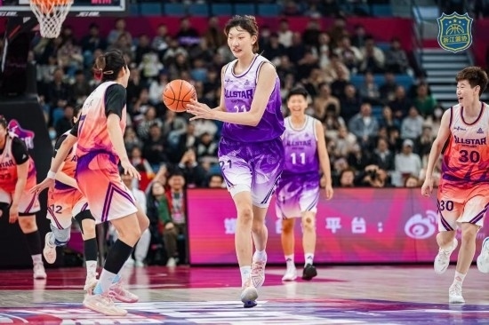與往屆不同,今年全明星正賽開場雙方球員就將“娛樂屬性”拉滿,讓球迷欣賞到平時在正式比賽中看不到的場面。北區(qū)隊先是安排了武桐桐背打韓旭的懸殊錯位,而后劉禹彤、張茹和潘臻琦將李緣高高舉起助其完成扣籃。南區(qū)隊也“不甘示弱”,李夢的運球引起陣陣歡呼,韓旭則在無人防守的情況下完成一記雙手扣籃,將現(xiàn)場氣氛烘托至高潮。