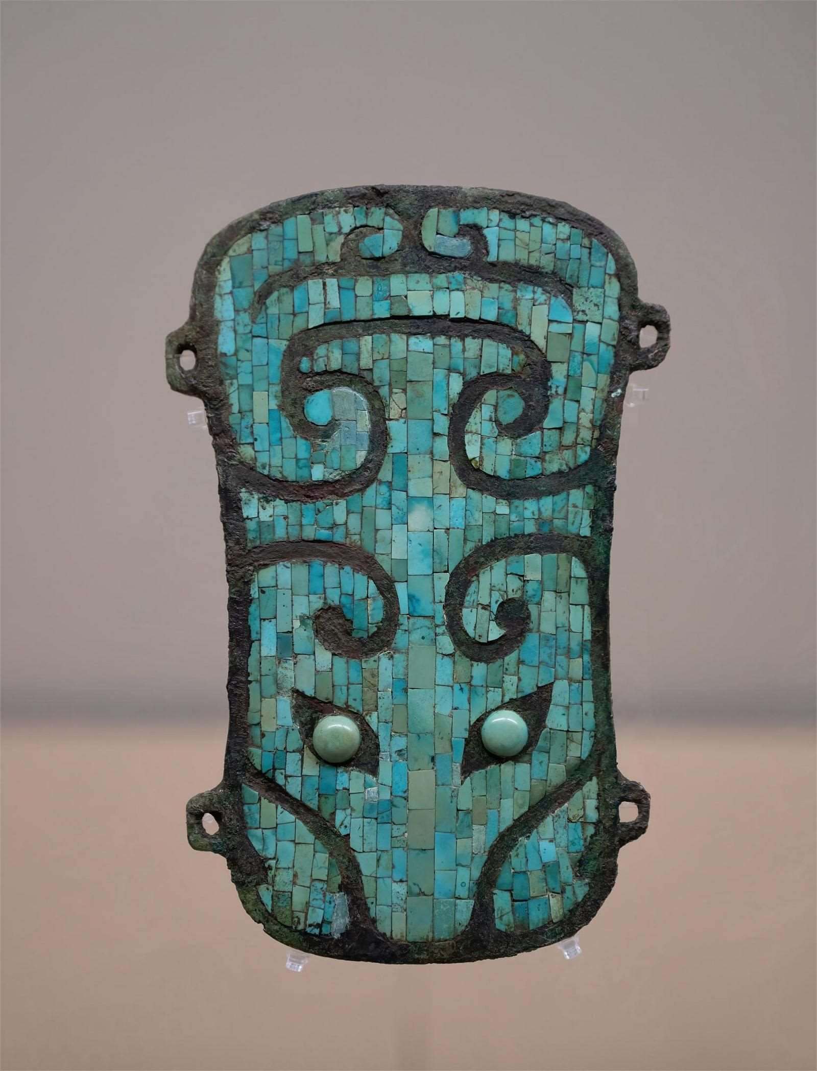 3500年前的鑲嵌綠松石獸面紋銅牌飾,是二里頭夏都遺址博物館的“頂流”。它器身用貴金屬青銅鑄出主體框架,略微拱起的弧形銅胎上,鑲嵌著數(shù)百片綠松石,神奇絢爛。它的發(fā)掘地二里頭遺址是中國(guó)古代文獻(xiàn)記載的第一個(gè)王朝夏朝的都城,牌飾上,綠幽幽的“眼睛”見證了“最早的中國(guó)”。