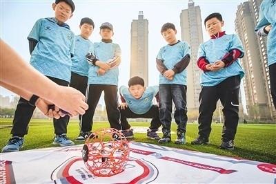 河北省唐山市豐南區(qū)胥各莊小學(xué)學(xué)生正在學(xué)習(xí)無(wú)人機(jī)足球操作要領(lǐng)。李福政攝(人民視覺)