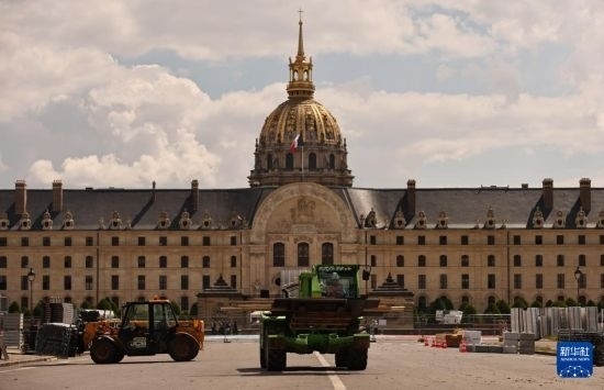 這是6月4日在位于法國巴黎市中心的榮軍院廣場拍攝的臨時比賽場地搭建現(xiàn)場。這里將在巴黎奧運(yùn)會期間舉辦射箭比賽。新華社記者 高靜 攝