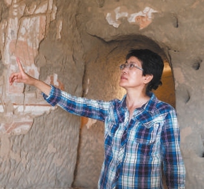 克孜爾石窟內(nèi),趙莉(見(jiàn)圖)對(duì)著壁面上的切割痕跡,與電腦里的數(shù)百?gòu)堈掌瑏?lái)回比對(duì),題材內(nèi)容、顏色、紋飾圖案,都要一一對(duì)應(yīng)。突然,腦海中一張照片精準(zhǔn)鑲嵌進(jìn)了缺失的那塊壁面——這樣的“靈感突現(xiàn)”,源于她對(duì)每個(gè)洞窟每幅壁畫(huà)以及被揭取痕跡的熟悉程度。在克孜爾石窟群穿梭了32年,作為克孜爾石窟研究院研究館員,每一個(gè)洞窟都深深刻印在了她的腦海中。
