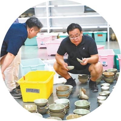 梁國(guó)慶(右)在整理出水文物。周瑩水?dāng)z