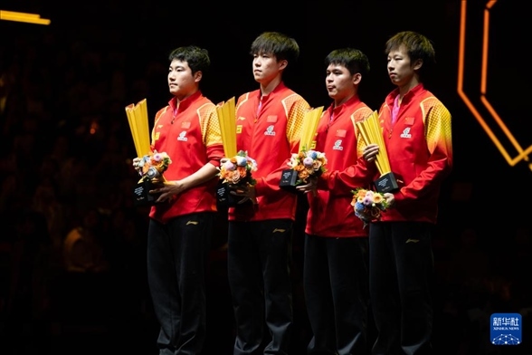 10月5日,冠軍王楚欽(左二)/梁靖崑(左一)和亞軍林高遠(yuǎn)(右一)/林詩棟在頒獎儀式上。新華社記者 肖藝九 攝