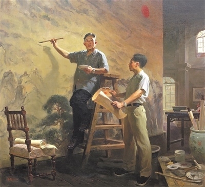 正在舉辦的第十四屆全國美術(shù)作品展覽進(jìn)京作品展上,撲面而來的藝術(shù)形象是腳踏中華大地的各族人民,是中國近現(xiàn)代文化史上的先賢圣哲,是和我們一道相擁而立的堂堂中國人。這些形象剛強(qiáng)勇毅,如潮如云,傳遞著眾志成城的精神力量,扣動(dòng)人心。譬如,呂鵬《山河頌》,以濃郁的色調(diào),再現(xiàn)傅抱石、關(guān)山月兩位前輩創(chuàng)作《江山如此多嬌》的情景,鐫刻新中國美術(shù)史上重要一幕;鄔大勇《我心中的英雄》塑造了畫家少年時(shí)代的英雄偶像——錢學(xué)森等一代科學(xué)家。還有許多氣勢宏大的創(chuàng)作,它們既是社會(huì)生活、時(shí)代精神的藝術(shù)載體,又是美術(shù)工作者面對歷史、面對人民的激情熔爐。這些作品以人民形象為根基,深植時(shí)代沃土,構(gòu)成歷史與現(xiàn)實(shí)相輝映的史詩畫卷。