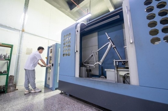 2023年4月13日,在深圳市喜德盛自行車股份有限公司實驗室,工作人員對車架進(jìn)行測試。新華社記者 毛思倩 攝