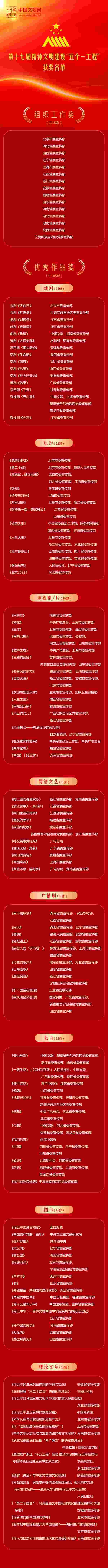 近日,中共中央宣傳部印發(fā)表彰決定,對(duì)第十七屆精神文明建設(shè)“五個(gè)一工程”組織工作先進(jìn)單位和優(yōu)秀作品進(jìn)行表彰。授予《齊白石》等15部戲劇作品、《流浪地球2》等12部電影作品、《問(wèn)蒼茫》等16部電視作品、《陶三圓的春夏秋冬》等10部網(wǎng)絡(luò)文藝作品、《禾下乘涼夢(mèng)》等10部廣播劇、《天山放歌》等12首歌曲,共105部作品“優(yōu)秀作品獎(jiǎng)”;授予北京、河北、山西、遼寧、上海、江蘇、浙江、安徽、福建、山東、河南、湖北、湖南、陜西、寧夏等15個(gè)省區(qū)市黨委宣傳部“組織工作獎(jiǎng)”。