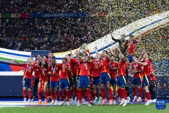 這是2024年7月14日,西班牙隊在2024歐洲足球錦標(biāo)賽決賽后的頒獎儀式上慶祝。新華社記者 肖藝九 攝
