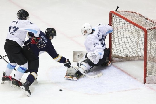 2024年12月8日,北京京獅男子冰球隊(duì)球員侯宇陽(中)在2024-2025賽季中國男子冰球職業(yè)聯(lián)賽(齊齊哈爾站)比賽中射門。新華社記者 張濤 攝