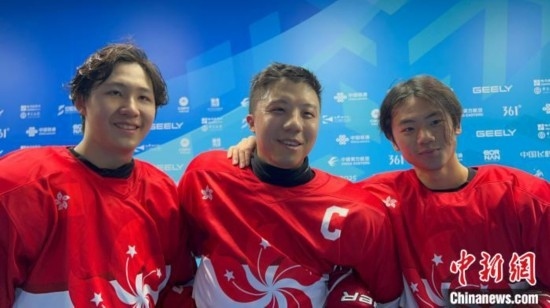 2月5日晚,在哈爾濱亞冬會(huì)男子冰球小組賽中,中國(guó)香港隊(duì)以30:0大勝印度隊(duì)。賽后,中國(guó)香港冰球運(yùn)動(dòng)員鄧博仁(左)、梁健邦(中)、朱澤熙(右)接受采訪。中新社記者 郭超凱 攝
