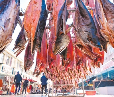 冬季的東極魚市,不僅能購買到種類繁多的冷水魚類制品,還可領略“萬物皆可凍”的東北民俗。因此,這里也成為游客來到撫遠后必去的“打卡地”。