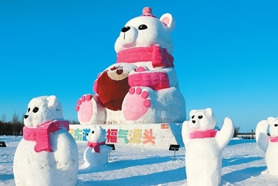 撫遠市濱江公園里的“莓莓熊”雪雕,吸引不少外地游客前來“打卡”。