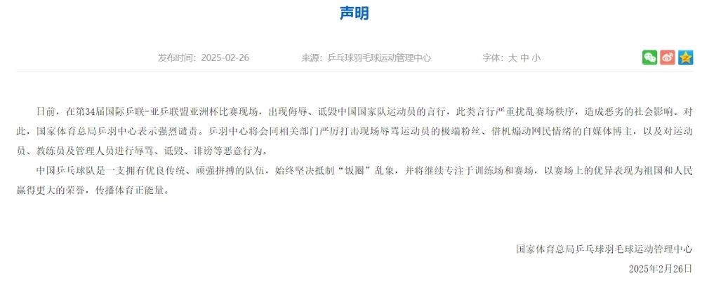 國家體育總局乒乓球羽毛球運(yùn)動管理中心26日發(fā)布聲明,強(qiáng)烈譴責(zé)嚴(yán)重?cái)_亂第34屆國際乒聯(lián)-亞乒聯(lián)盟亞洲杯賽場秩序、造成惡劣社會影響的行為,并將會同相關(guān)部門進(jìn)行嚴(yán)厲打擊。