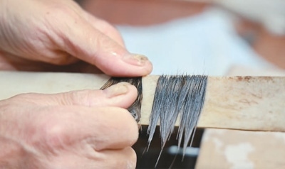 制作筆頭從理毫開(kāi)始,將毛的根部理齊。然后整理毛的頭部,這一步叫齊毫。齊毫后的筆毛變成一片一片的,方便做成圓錐形。圖為齊毫。