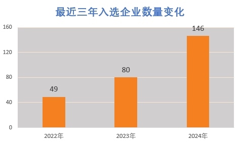 據了解,入選企業(yè)評選標準非常嚴格,需同時滿足專業(yè)化、精細化、特色化、創(chuàng)新能力、產業(yè)鏈配套等多個指標。盡管如此,2024年名單中的企業(yè)與2022年49家和2023年80家相比,大幅增加到146家。