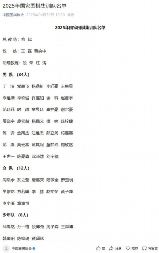 據(jù)國家圍棋集訓(xùn)隊選拔小組負責(zé)人介紹,根據(jù)《國家圍棋集訓(xùn)隊運動員入隊標準》,報中國圍棋協(xié)會批準,共有54人入選2025屆國家集訓(xùn)隊。男隊由王星昊、丁浩、黨毅飛、楊鼎新、李軒豪、李維清、李欽誠等34名棋手組成;女隊有12人,包括周泓余、於之瑩、唐嘉雯等。此外,國少隊還有8名棋手。國家圍棋集訓(xùn)隊的教練組由5人組成,俞斌擔(dān)任總教練,王磊、黃奕中擔(dān)任教練,段榮和汪濤任助理教練。