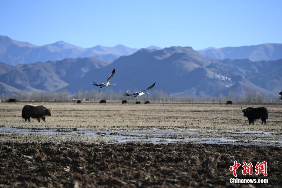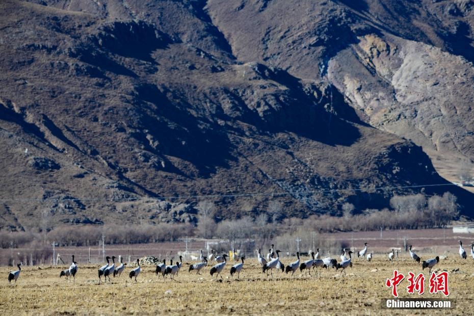 12月20日,黑頸鶴在西藏拉薩市林周縣虎頭山水庫周邊的冬灌地里棲息。嚴冬時節(jié),拉薩河谷沿線的草甸、山巒、候鳥、寺廟構成一道獨特的風景線。 中新社記者 貢嘎來松 攝