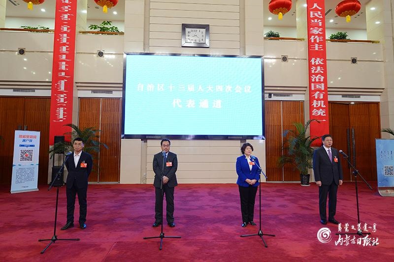 1月27日晚,自治區(qū)十三屆人大四次會(huì)議“代表通道”集中采訪活動(dòng)在內(nèi)蒙古人民會(huì)堂玻璃廳舉行,8位人大代表分兩組“亮相”。這是自治區(qū)人大首次開(kāi)通“代表通道”。圖為人大代表陳功明、劉淑華、唐毅和龔明珠4位代表(從左至右)回答記者提問(wèn)。內(nèi)蒙古日?qǐng)?bào)記者 金泉 攝
