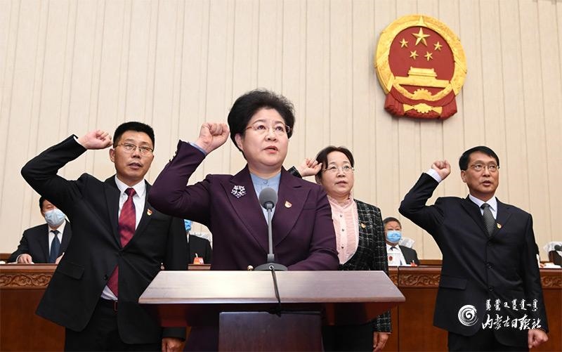 1月20日上午,自治區(qū)十三屆人大常委會第二十四次會議舉行了憲法宣誓儀式。自治區(qū)黨委書記、人大常委會主任石泰峰主持并監(jiān)誓。圖為新任職人員在依法進行憲法宣誓。內蒙古日報記者 袁永紅 攝
