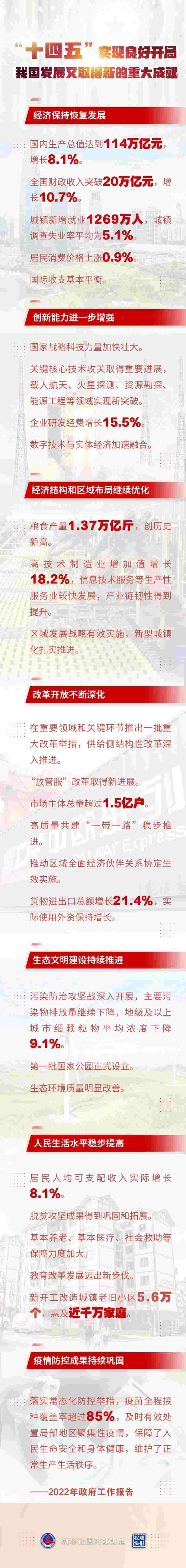——改革開放不斷深化。在重要領(lǐng)域和關(guān)鍵環(huán)節(jié)推出一批重大改革舉措,供給側(cè)結(jié)構(gòu)性改革深入推進(jìn)?!胺殴芊备母锶〉眯逻M(jìn)展。市場主體總量超過1.5億戶。高質(zhì)量共建“一帶一路”穩(wěn)步推進(jìn)。推動區(qū)域全面經(jīng)濟(jì)伙伴關(guān)系協(xié)定生效實(shí)施。貨物進(jìn)出口總額增長21.4%,實(shí)際使用外資保持增長。