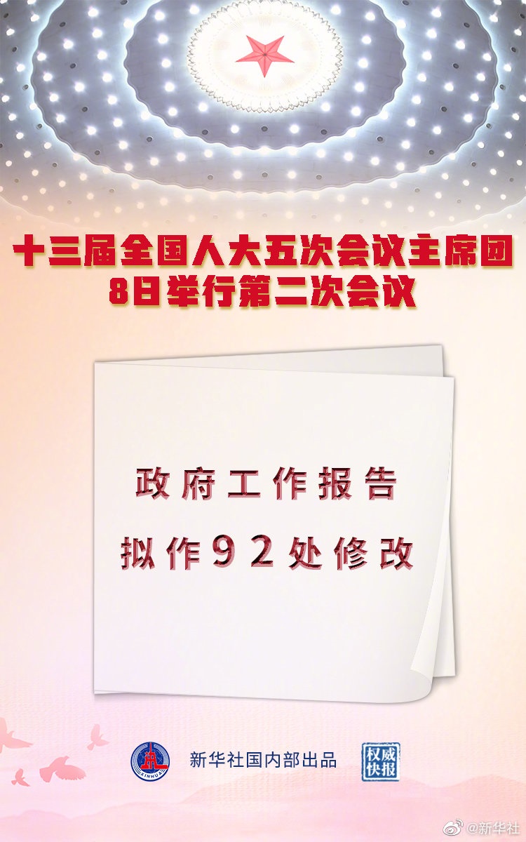 記者8日從十三屆全國人大五次會議主席團(tuán)第二次會議上獲悉,政府工作報告擬作92處修改?! ?br/>