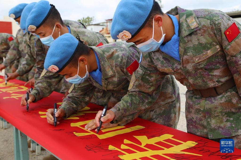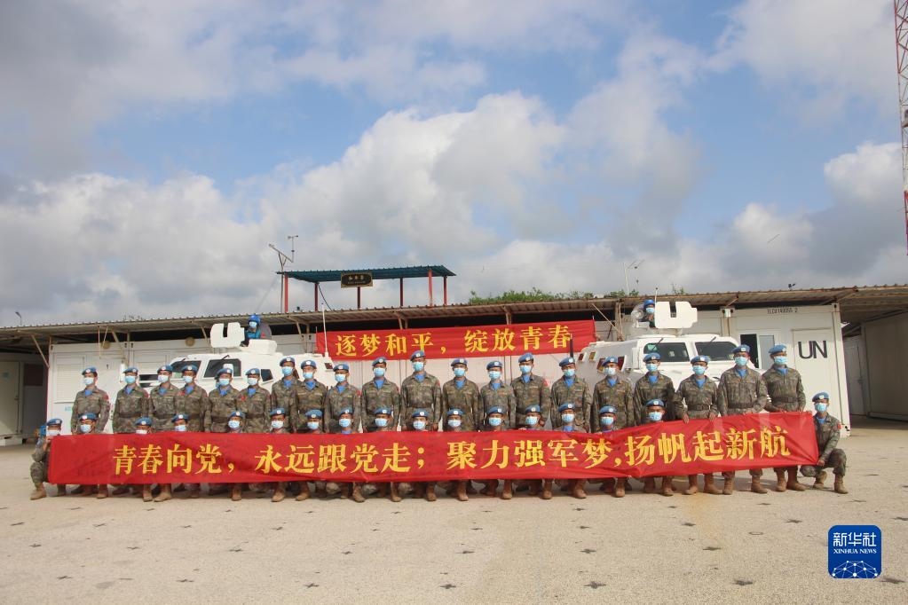“我宣誓:忠于黨,忠于社會主義,忠于祖國,忠于人民……揚藍(lán)盔精神,展大國形象,為祖國爭光,為軍旗添彩?!敝袊伯a(chǎn)主義青年團成立100周年之際,在黎巴嫩南部提爾市沙馬村的中國維和營區(qū),中國第20批赴黎巴嫩維和建筑工兵分隊的官兵們頭戴貝雷帽,身穿配有五星紅旗臂章的星空迷彩服,擺成數(shù)字“100”的隊形,面向國旗和聯(lián)合國旗莊嚴(yán)宣誓。