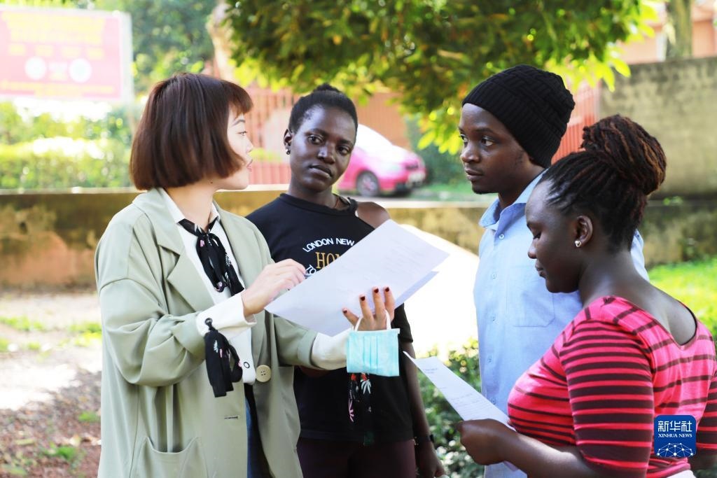 2022年4月19日,在烏干達(dá)首都坎帕拉,麥克雷雷大學(xué)孔子學(xué)院中文教師王夢云(左)與學(xué)生進(jìn)行交流。新華社記者張改萍攝