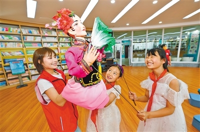 靳媛指導(dǎo)小學(xué)生學(xué)習(xí)杖頭木偶戲的操縱?! ?/p>
