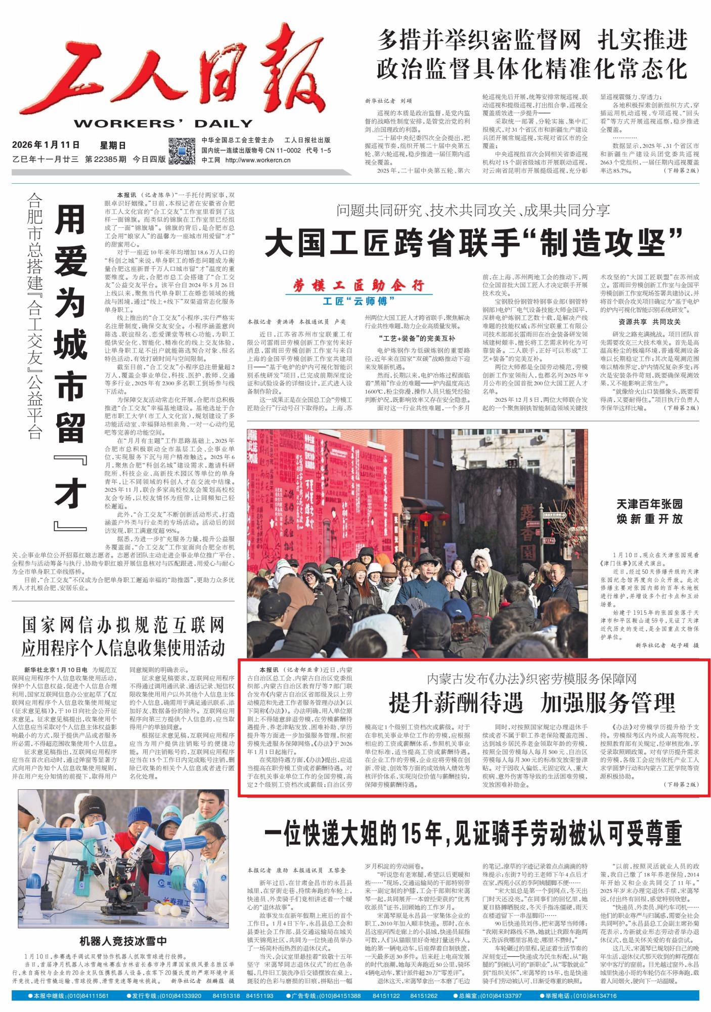 2026年1月11日,《工人日報》頭版刊發(fā)了《提升薪酬待遇 加強服務(wù)管理》的文章,報道了2026年1月1日起,內(nèi)蒙古7部門聯(lián)合施行省部級及以上勞模服務(wù)管理辦法,明確用人單位原則上不得隨意辭退勞模,從薪酬提升、退休榮譽津貼發(fā)放、困難補助、學歷提升支持、失業(yè)優(yōu)先再就業(yè)及住房優(yōu)先保障等方面強化服務(wù)保障,并建立屬地管理及違法違紀等情形的退出機制。
